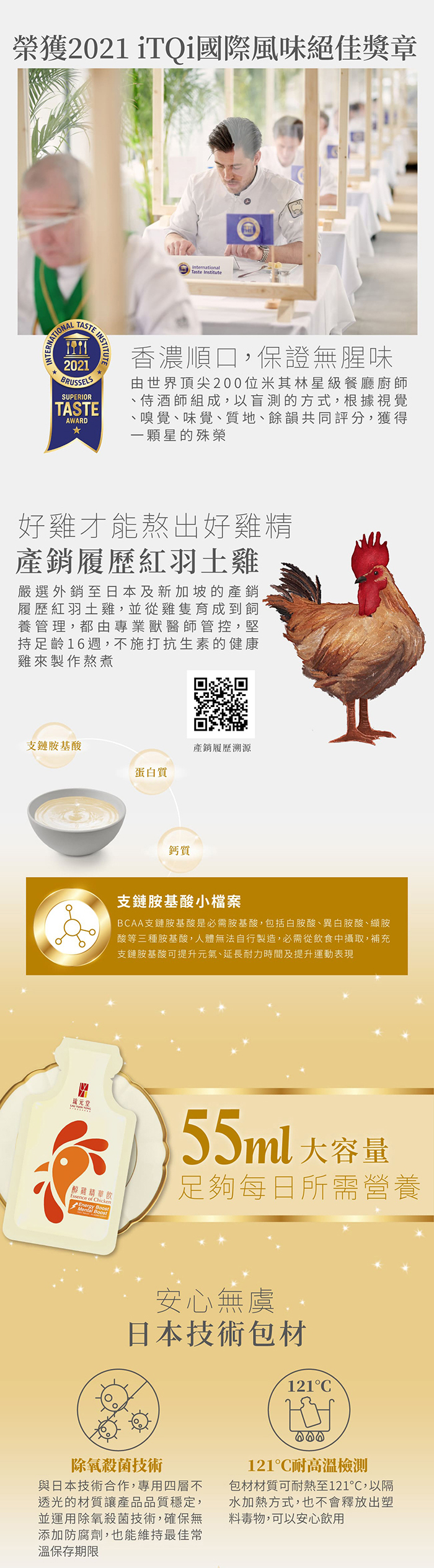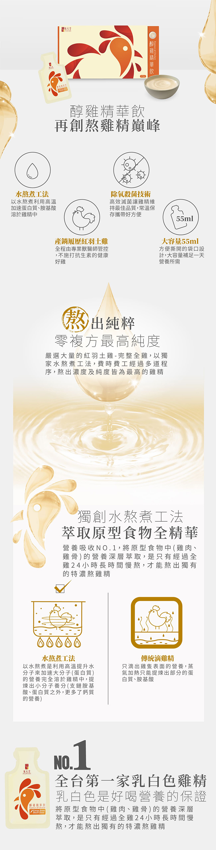 嚴選產銷履歷的紅羽土雞,以水熬煮工法,24小時熬出純粹,再創熬雞精巔峰,費時費工深層熬出雞肉、雞骨營養精華,獨有的乳白色光澤更是好喝營養的保證。