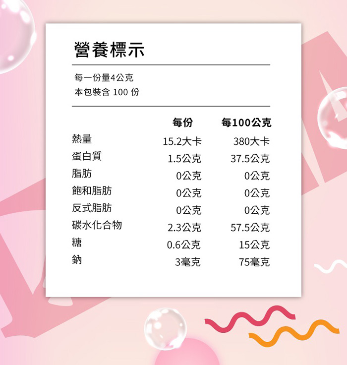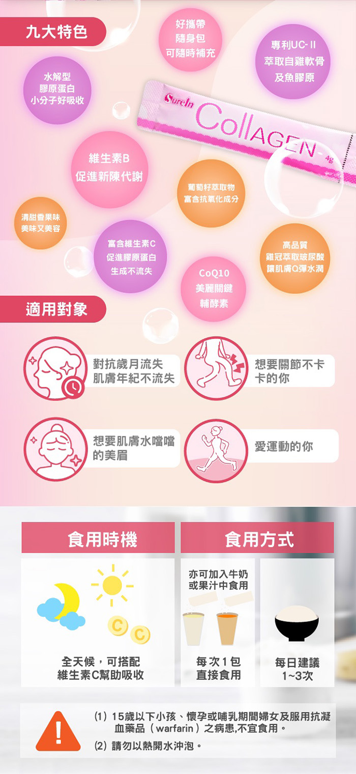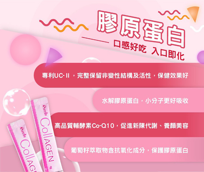 成分:魚膠原蛋白、蔗糖、蘋果果汁粉(檸檬酸、檸檬酸鈉、砂糖、麥芽糊精、蘋果酸、香料、焦糖色素、蘋果濃縮汁)、麥芽糊精、D-山梨醇(甜味劑)、果糖粉、香料(乳糖、香料、二氧化矽)、羧甲基纖維素鈉、無水檸檬酸、 水解二型膠原蛋白(萃取自雞軟骨)、輔酵素Q10、關華豆膠、膠原蛋白複合物