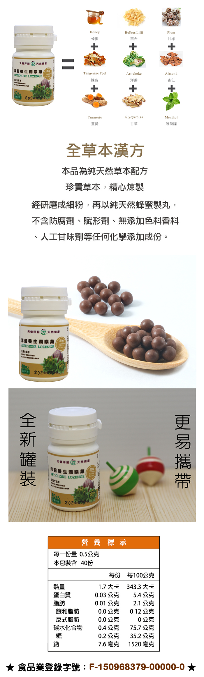 |成  份|蜂蜜、百合、甘梅、甘草、陳皮、杏仁、薑黃、洋薊、石斛、桔梗、紫錐菊、阿拉伯糖、薄荷腦。