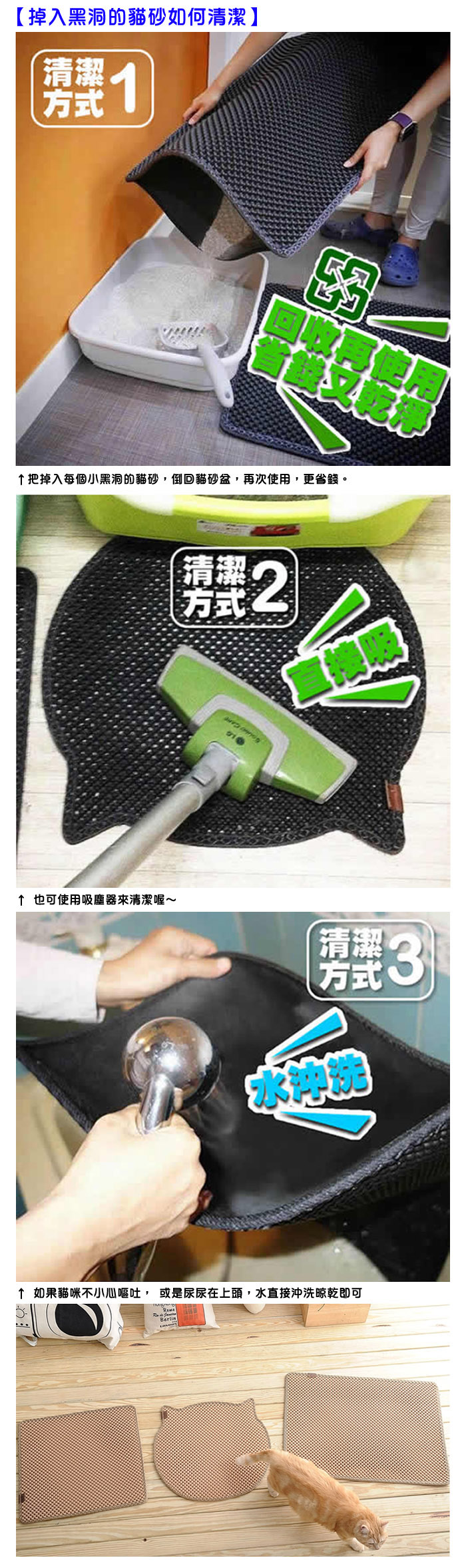 ※ 提醒尊重每個人的創作,Blackhole Cat Litter Mat®設計師用心血開發了解決貓奴的專利產品,這兒的每一張圖和每一個文字描述,都是我們針對Blackhole Cat Litter Mat®落貓砂墊而產出的,這也是我們最真實的使用心得,在盜用前請先問問自己,您的心血願意被這樣亂擷取嗎? 如果您對自己的產品負責任,對您的顧客付出真心,請勿盜用我們的商品照片和圖文,盜用者我們將保留法律追訴!謝謝您尊重智慧財產。(補充說明:國外原廠的圖片請勿使用,國外授權由我們負責台灣的貓砂墊銷售包含國外的所有圖片和影片使用,若擅自盜用者,將訴求法律行動。)